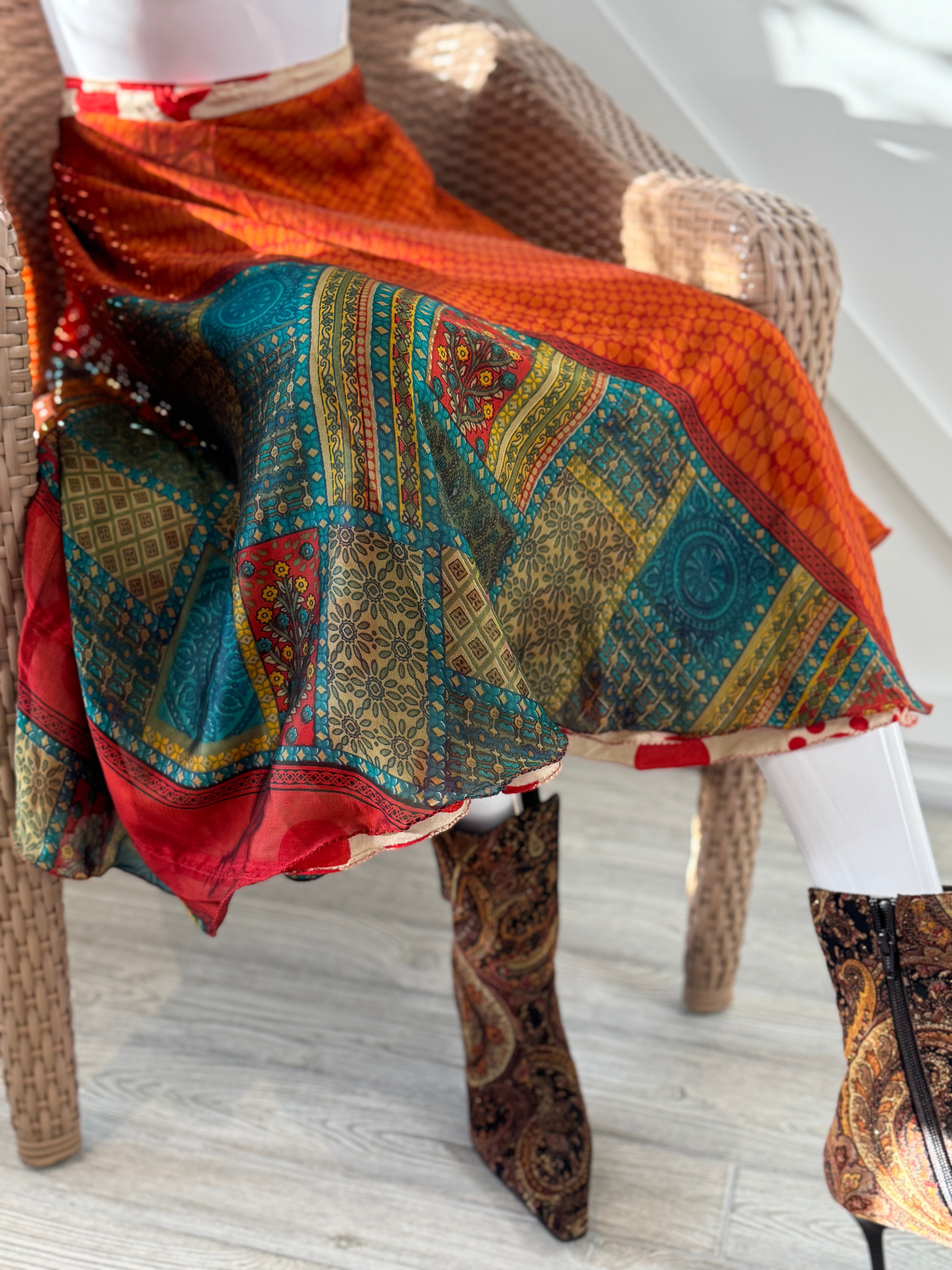 Introducing the Mytri (pronounced as My-three) Premium Collection Saree Wrap Skirts! These exquisite skirts are meticulously crafted using specially sourced sarees. Each Mytri skirt is made from sarees sourced from the vibrant South Indian states, offering a wide array of recycled fabrics. Get ready to unleash your inner fashionista with our Mytri Premiums and achieve an elegant, radiant look!